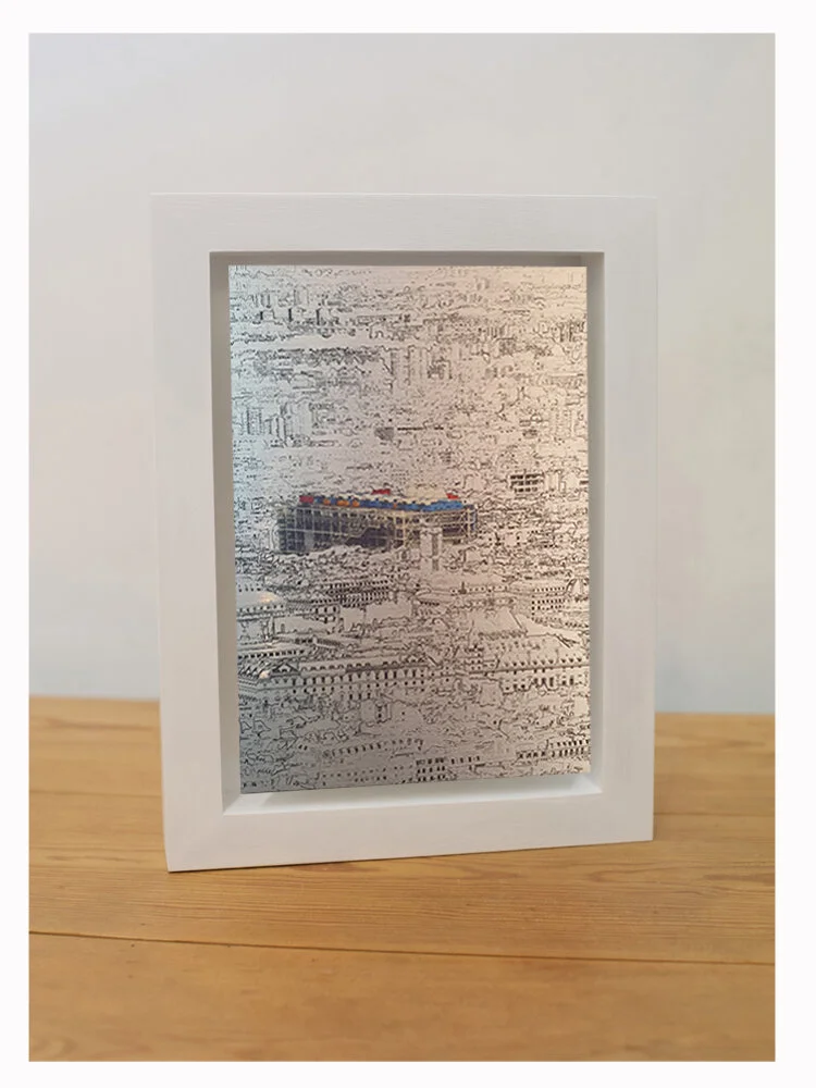 This piece is made from an original photograph taken from Monmatre, the highest point in Paris. The image is digitally manipulated to trace the outlines of the Paris rooftop, whilst leaving the picture of the building untouched. It is printed on a small sheet of brushed aluminium, which gives the piece an etched appearance, and floated in a hand-painted wood frame.