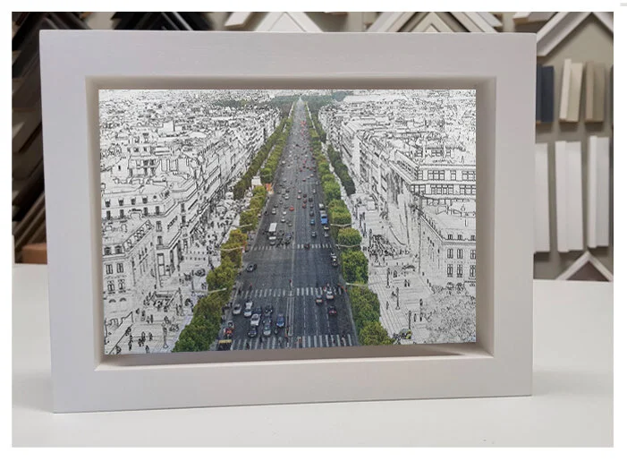 This piece is created from a photograph of the Champs Elysees taken from from the top of the Arc de Triomphe in Paris. I wanted to show the contrast between the never-ending tree-lined avenue and the historic buildings it carves through. The Champs Elysees itself has been left untouched from the original photograph while it’s surroundings have been digitally altered to highlight the patterns of the streets. Printing the image on a small sheet of brushed aluminium picks out the landscape’s details and contrasts it perfectly with the tree-lined avenue. The image is floated in a hand-painted white wood frame.